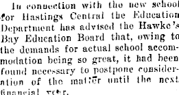 In connection with tho new school for Hastings Central the Education Department has advised tho Hawke's Bay Education Board that, owing to the demands for actual school accommodation being so great, it had been found necessary to postpone consideration of the mill ter until the next financial
