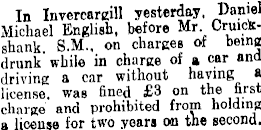 In Invercargill yesterday. Daniel Michael English, before Mr. Cruickshank. S.M.. on charges of being drunk' while in charge of a car and driving a car without having a license, was fined £3 on the first charge and prohibited from holding a license for two years on the second.