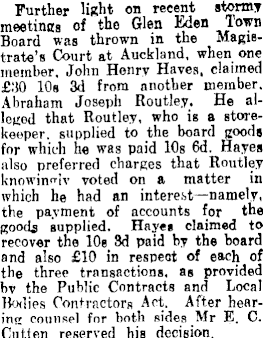 Further light on recent stormy meetings of tho Glen Eden Town Board was thrown in the Magistrate’s Court at Auckland, when one member. John Henry Haves, claimed £3O 10s 3d from another member. Abraham Joseph Routley. He alleged that Routley, who is a storekeeper. supplied to the board goods for which he was paid 10s fid. Hayes also preferred charges that Routley knowinHv voted on a matter in which he had an interest—namely, the payment of accounts for the goods supplied. Hayes claimed to recover the 10s 3d paid by the board and also £lO in respect of each of the three transactions, as provided by the Public Contracts and Local Ikulies Contractors Act. After hearing counsel for both sides Mr E. C. Cntlen reserved his decision.