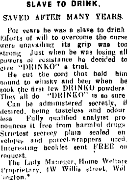 SLAVE TO DRINK, SAVED AFTER MANY YEARS For years he was a slave to drink Efforts of will to overcome tho curse were unavailing its grip was too strong Just when be was losing all powers ol resistance he decided to give “DRINKO” a trial. He cut the cord that held hnn bound to whisky and beer when he took the first few DRINKO powders I'liey all do '‘DRINKO” is so sure Can be administered secretly, if desired, being tasteless and odour less Fully qualified nnalyist pro nonnees it free from harmful drugs Strictest secrecy plain sealed en velope? and parcel-wrappers jrned. Interesting booklet sent FREE on request. Die Lady Manager, Home Welfare I’roprietnry. fW Willis street. Wei ington *