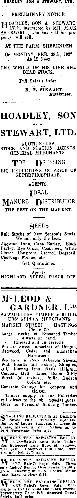 HOAOLEY. SON A STEWART, LTD. PRELIMINARY NOTICE, HOADLEY, SON A STEWART. LTD., instructed by MR. MICK SHERWOOD, who has sold his property, will sell: AT THE FARM, SHERENDEN On MONDAY, FEB. 28th, 1927 At 12 Noon THE WHOLE OF HIS LIVE AND DEAD STOCK. Full Details Later. h. nTstewart, Auctioneer. HOADLEY, SON STEWART, LTD. AUCTIONEERS, STOCK AND STATION AGENTS, GENERAL MERCHANTS. TOP DRESSING BIG REDUCTIONS IN PRICE OF SUPERPHOSPHATE. AGENTS: IDEAL SJANURE D ISTRIBUTOR THE BEST ON THE MARKET. SEEDS Full Stocks of New Season’s Seeds. We sell only the best. Algerian Oats, Cape Barley, Black Barley, Rye Glass, Cocksfoot, White Clover, Cowgrass, Crested Dogstail, Chewings Fescue, etc Get Quotations. Agents HIGHLAND SUPER PASTE DIP. M C LEOD & GARDNER. L w SAWMILLEHS, TIMBER BUILDERS’ SUPPLY MERCHANTS MARKET STREET HASTINGS 'Phone 199, Large stocks of Seasoned Timber . always on hand. (dressed and undressed). We are direct importers of Oregon, Redwood, Cedai and Australian Hardwoods We have in stock Asbestos Sheets, Wall Boards tall makes), Shingles, U.C Roofing Iron Nails, Ridging, Cement, Hyd Lime, Doors, 3-Ply Womb (all makes). Pudlo, Hudson boilers, etc. Concrete Casings for coppers and timber. Timber supply ex our Puketitin mill direct to the job. Special quotalions for Farmers’ Building Timber. Smashing bisductions at BAiKD’b .Royal Sale. Ten-Day Specials. Big lot of Ladita' Jumpers, in Crepe de Cheue, Marocains, etc. Values up to 42/6, Throw-out Price 5/11. HERE L’HE BARGAINS REALLY A RE—Baird’s Royal Sale. Yellow Box Holeproof Lisle Hose, all shades, 2/11 pair. Holeproof Silk Hose, now 4/6, 6/6, 9/6, 12/6 pair. WHERE THE BARGAINS REALLY A RE—Baird’s Royal Sale. Three only Ladies’ Beaded Overdresses. Usually £5 5/ clearing at 27/6. Ladies’ Motor Diist Coats to clear 6/11. HERE - T HeFbARG AINS “REALLY ARE—Baird’s Royal Sale. Oddments fn Ladies’ Voile and Linen Frocks. Throw away Price 8/6. Assorted Tweed Skirts, half price.
