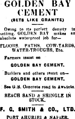GOLDEN BAY CEMENT (SETS LIKE GRANITE) Owing to its perfect density in setting. GOLDEN BAY makes an absolute waterproof iob for— FLOOBS. PATHS, COW-YARDS, WATER-TROUGHS, Etc. Farmer* insist on GOLDEN BAY CEMENT. Builders and others insist on— GOLDEN BAY CEMENT. See G.B. Concrete road to Awatoto. BEACH SAND * SHINGLE LN STOCK. F. C. SMITH~4 CO., LTD. PURT AHURIRI & NAFIER.