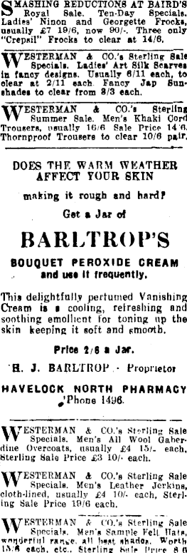 SMASHING REDUCTIONS AT BAIRD’S Royal Sale. Ten-Day Specials. Ladies’ Ninon and Georgette Frocks, usually £7 19/6, now 90/-. Three only "Crepsil" Frocks to clear at 14/6. TMTEBTERMAN 4 CO.’s Sterling Sale v v Speciale. Ladies’ Art Silk Scarves in fancy designs. Usually 6/11 each, to clear at 2/11 each Fancy Jap Sunshades to clear from 3/3 each. ESTERMAN A CO?s Steriinr Summer Sale. Men’s Khaki Cord Trousers, usually 16/6 Sale Price 14 6. Thornproof Trousers to dear 10/6 pair. DOES THE WARM WEATHER AFFECT YOUR SKIN making it rough and hard? Get a Jar of BARLTROP’S BOUQUET PEROXIDE CREAM and use It frequently. This delightfully perfumed Vanishing Cream is a cooling, refreshing and soothing emollient for toning up the skin keeping it soft and smooth. Price 2 6 a Jar. H. J. BARLIBOP ■ Proprietor HAVELOCK NORTH PHARMACY J Phone 1496 IXTESTERMAN & CO.’b Stirling Sale ▼ v Specials. Men’s All Wool Gaberdine Overcoats, usually £4 15/. each, Sterling Sale Price £3 10/- each. WESTERMAN & CO.’s Sterling Sale Specials. Men’s Leather Jerkins, cloth-lined, usually £4 10/- each, Step], ing Sale Price 19/6 each. WESTERMAN A CO.’s Sterling Sale Specials. Men’s Sample Fell Hats, wnndrrlul ranwe. a’l best shadow. W o rth 15 6 each. etc.. Sterling Snlr l*i*wc 8(1
