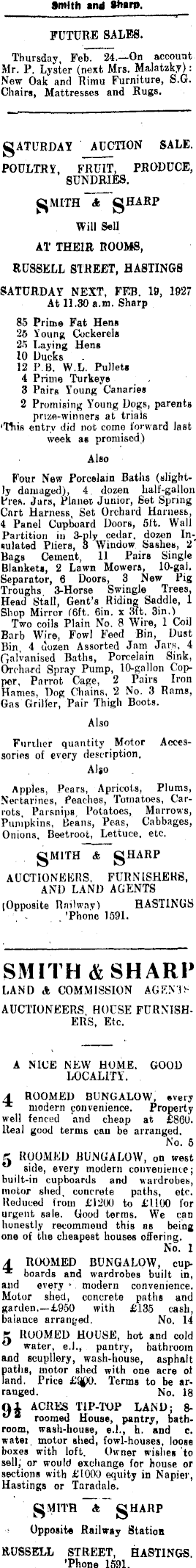 Smith and Sharp. FUTURE SALES. Thursday, Feb. 24.—0 n account Mr. P, Lyster (next Mrs. Malatzky): New Oak and Rimu Furniture, S.G. Chairs, Mattresses and Rugs. gATURDAY AUCTION SALE. POULTRY, FRUIT, PRODUCE, SUNDRIES. SJMITH <& gHARP Will Sell AT THEIR ROOMS, RUSSELL STREET, HASTINGS SATURDAY NEXT, FEB. 19, 1927 At 11.30 a.m. Sharp 85 Prime Fat Hens 25 Young Cockerels 25 Laying Hens 10 Ducks 12 P B. W.L. Pulleta 4 Prime Turkeys 3 Pairs Young Canaries 2 Promising Young Dogs, parents prize-winners at trials 'Hiis entry did not come forward last week as promised) Also Four New Porcelain Baths (slightly damaged), 4 dozen half-gallon Pres. Jars, Planer Junior, Set Spring Cart Harness, Set Orchard Harness, 4 Panel Cupboard Doors, 51t. Wall Partition in 3-ply cedar, dozen Insulated Pliers, 3 Window Sashes, 2 Bags Cement, 11 Pairs Single Blankets, 2 Lawn Mowers, 10-gal. Separator, 6 Doors, 3 New Pig Troughs 3-Horse Swingle Trees, Head Stall, Gent’s Riding Saddle, 1 Shop Mirror (6ft. Gin. x 3ft. 3in.) Two coils Plain No. 8 W’ire, 1 Coil Barb Wire, Fowl Feed Bin, Dust Bin, 4 dozen Assorted Jam Jars, 4 Galvanised Baths, Porcelain Sink, Orchard Spray Pump, 10-gallon Copper, Parrot Cage, 2 Pairs Iron Hames. Dog Chains, 2 No. 3 Rams, Gas Griller, Pair Thigh Boots. Also Further quantity Motor Accessories of every description. Also Apples, Pears, Apricots, Plums, Nectarines, Peaches, Tomatoes, Carrots. Parsnips, Potatoes, Marrows, Pumpkins, Beans, Peas, Cabbages, Onions. Beetroot, Lettuce, etc. gMITH & AUCTIONEERS. FURNISHERS, AND LAND AGENTS (Opposite Railway) HASTINGS ’Phone 1591. SMITH & SHARP LAND A COMMISSION AGENTS AUCTIONEERS HOUSE FURNISHERS, Etc. A NICE NEW HOME. GOOD LOCALITY. 4 ROOMED BUNGALOW, every modern convenience. Property well fenced and cheap at £861). Real good terms can be arranged. No. 5 K ROOMED BUNGALOW, on west u side, every modern convenience; built-in cupboards and wardrobes, motor shed, concrete paths, etc. Reduced from £l2OO to £llOO for urgent sale. Good terms. We can honestly recommend this as being one of the cheapest houses offering. No. 1 A ROOMED BUNGALOW, cup- * boards and wardrobes built in, and every modern convenience. Motor shed, concrete paths and garden.—£9so with £135 cash, balance arranged. No. 14 K ROOMED HOUSE, hot and cold water, e.L, pantry, bathroom and scupllery, wash-house, asphalt paths, motor shed with one acre of land. Price £S$O. Terms to be arranged. No. 18 (11 ACRES TIP-TOP LAND; 8- • roomed House, pantry, bathroom, wash-house, e.L, h. and c. watei motor shed, fowl-houses, loose boxes with loft. Owner wishes to sell; or would exchange for house or sections with £lOO9 equity in Napier, Hastings or Taradale. A SHARP Opposite Railway Station RUSSELL STREET, HASTINGS. ’Phone 1591.