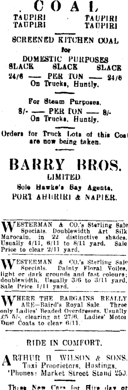 CO A L TAUPIRI TAUPIRI TAUPIRI TAUPIR] SCREENED KITCHEN GOAL for DOMESTIC PURPOSES SLACK SLACK SLACK 24/6 PER TON 24/6 On Itucki, Huntly. For Steam Purposes, 8/ per ton —8/On Truck*. Huntly. Orders for Truck ixits of this Coal are now being taken. BARRY BROS. LIMITED Sole Hawke's Bay Agenta, PORI AHIiRIRj & NAPIER. WESTERMAN A CO.’b Sterling Sale Specials. Doublewidth Art Silk Marocain, in 22 distinctive shades. Usually 4/11, 6/11 to 8/11 yard. Sale Price to clear 2/11 yard. YVfESTERMAN A CO.’s Sterling Sale ▼ ▼ Specials. Dainty Floral Voiles, light or dark grounds and fast, colours; doublewidth. Usually 3/6 to 3/11 yard. Sale Price 1/11 yard. WHERE THE RARGAINS REALLY ARE—Baird’s Royal Sale Three only Ladies’ Beaded Overdresses. Usually £5 5/-. clearing at 27/6. Ladies’ Motoi Dust Coats to clear 6/11. RIDE IN COMFORT. ARTHVR H WILSON A' SONS. Taxi Proprietors, Hastings. 'Phones: Market Street Stand 253. Tli)«* New r«t*« lor Hire ot