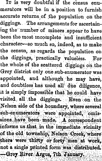 It is very doubtful if the census enumerators will be in a position to furnish accurate returns of the population on the diggings.. The arrangements for ascertaining the number of miners [appear to have been the most incomplete and insufficient character—so much so, indeed, as to make the census, as regards the population oh the diggings, practically valueless. For the. whole of the scattered diggings on the Grey district only one sub-enumerator was appointed, and although he may have, arid doubtless has used all' due diligence, it is simply impossible that, hp.codd* have visited - all ,the . diggings. . Even -on the Nelson side of the boundary, where several sub-enumerators [were' 1 appointed,'ipiniSsions have been * inade. ■; i JL correspondent informs us that,in the immediate.; -vicinity of the bid tbwhshipj' NeisoA theirs 4 were thfrty or forty > iiaeif’ at work, not a single .printed wasj distributed. —Grey River, Argue, 7th January, .