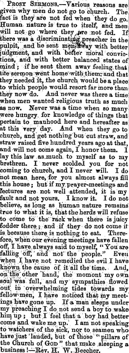 Prosy Sermons.— Various reasons are given why men do not go to church. The fact is they 1 are not fed when they do go. Human, nature is true to itself, and men vrill not go where] they jae /not fed. If there was a dfecriminatjganreacher in the pulpit, ]and he sent menjlway nrith better judgment, and with beifte'r morar convictions, and with better balanced states of hiind ; if he sent them away feeling, that irab sermon went home 'withthemr and that they needed it, the church would be a plaee to which people would resort far inore than they now do. And never was there a time when men wanted-religious truth as much as now. Never was a time when so many were hungry, for knowledge of things that pertain to manhood here and hereafter aB at this very day. And when they go to church, and get nothing but cut straw, and straw raised five hundred years ago at that, and will not come again, I honor them. I lay this law as .much to myself as to my brethren. I never scolded you for not coming to church, and I never will. Ido not mean here, for you almost always fill this house; but if my.prayer-meetings and lectures are not well attended, it is my fault and not yours. I know it. Ido not believe, as long as human nature remains true to what it is, that the herds will refuse to come to the’rsick when there is juicy fodder there;. and if they do not come it is because there is. nothing,to eat. Therefore, when our evening meetings have fallen off, I have, always said to myselfj “Yob are falling Off] 1 and not* the people.” Even when I have not remedied the evil I have knoWn thie cause of it all the'time. And, on the" other hand,' the momont my own spul Vas full, and my sympathies flowed out/ in ; overwhelming tides towards my fellow;men, I have noticed that my meet-' ings have gone up. If a man sleeps under my preaching I do mot send a boy to wake him up ; but I feel that a /boy had. better come and wake me up./ lam not speaking to watcbers of the sick, nor to. seamen who have just J landed, bbt of those “ pillars of the Church of God ” that make .sleeping a business !—Rev. H. W. Beecher.