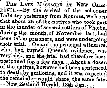 The Latb Massacre at New Caledonia. —By the arrival of the schooner Industry yesterday from Noumea, we.learn that about 25 of the, natives who took part in the .murder of severahsettlers. of Phoebe; during the , mpnth ;of November last, had been taken prisoners, and were undergoing their,.triaL One r: of the principal witnesses, who, had tuineoi. Queen’s evidence,, was very] sick, and the-trial, had therefore been postponed for- a few days, -.About a dozen of the .natives, however, had been sentenced to aeath,by/guillotine,,and it .was expected the. remainder would Abare ; the same fatei *T^ .Zealand Herald,l3th Jan. ?,/ ■ ,