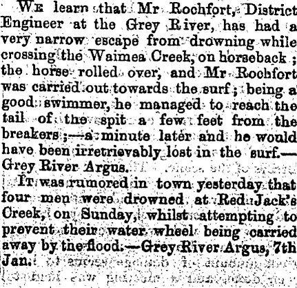 /We learn ;,that /Mr District Engineer at the Grey /River, has, had a very narrow. escape' while crossingithe Waiinea Creek; on hbrseback ; the. horae'-iTolledM over/and/Mr-Roobfort was came'd/out;.t6wards;:the-sur£.;/:being. a' good;! swimmer,she managed to,- reach/the tail,: -of; • thevebpit: a; few t feet from/the later and: he would have,bCeb/irfetrievablyJost in?the bui£— Grey,River- Argtw.:: ; T / y.C/'.V I iTiwas ran town: Greek;/on/Sundayi/whilstKAttempting/to pjreyrat-theirpwater/^ away bythedlood.—Grey rßlver.Arguß,7th Jpni i.