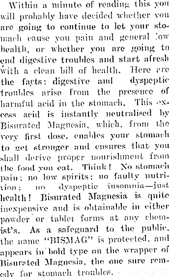 Within a minute- of reading this you will probably have decided whether you are going to continue to let your .stomach cause you pain and general .ow health, nr whether von are going to end digestive troubles and start alre.sh with a clean bill of health. Here are the facts: digestive and dyspeptic troubles arise from the presence of harmful acid ill the stomach. This excess acid is instantly neutralised by Bisurnted Alagncsia, which, from the very first dose, enables your stomach to act stronger and ensures that you shall derive proper nourishment 1 1*0111 the food you oat. Think! No stomach pain; 110 low spirits; no faulty nutrition; no dyspeptic- insomnia—just health ! Bisurnted Magnesia is quite inexpensive and is obtainable ill either powder or tablet forms at any clieniist’s. As a safeguard to the public-, the name “BTSAIAG” is protected, and appears in bold type 011 the wrapper of Bisurnted Alagncsia. the one sure remedy for stomach troubles.