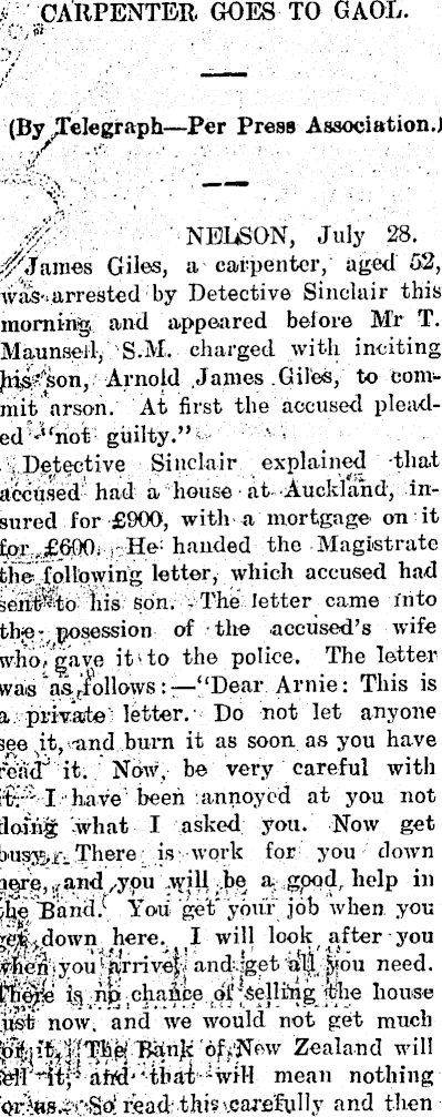 ji CARPENTER, GOES TO GAOL. (By Telegraph—Per Presß Association.) ' ,0 NELSON, July 28. ■o ames Giles, a carpenter, aged 52, was*,arrested by Detective Sinclair this morning, and appeared before Mr T. Maunsell, S.M. charged with inciting JiisMson, Arnold James Giles, to commit arson. At first the accused pleaded''“not guilty.” l .Defective Sinclair explained that accused had a house at Auckland, insured for £9OO, with a mortgage on it fl^ B £6£|or ;-E> : handed the Magistrate the’.following letter, which accused had sehiAto bis son. • The letter came into the • posession of the .accused’s wife who, gave it*to the police. The letter was'as follows:—“Dear Arnie: This is a. private letter. Do not let anyone see .it, and burn it as soon as you have redd 0 it. Now, be very careful with iCr 1 I have been annoyed at you not doing what I asked you. Now get bus®iiThere: is work for you down hgre, ;f and y ypu will .be a gpod, help in You ge't' your job when you down here. t I will look ; after you and.'get 'h'l|L |*6u need. ig. ; ng chance t of 'sellinglithe house [pst now, and we would not get much Kinjf off New Zealand will mean nothing Forf«s.¥CSoi read- this \carefully and then