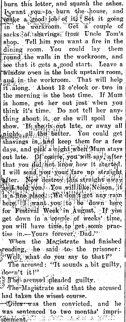 burn this letter, and squash the ashes. Kwant burn the'.house, and it|f Set it going *5nT-'the 'Workroom. Get a couple of sacks >'of ; •’sfeavingst'ff.orii Uncle Tom’s shop. Tell .him you want a fire in the dining room. You could lay them Toun? the walls in the workroom, and see that it gets a t good start; Leave a ‘Window onen in the back upstairs room, jf.auditn; the workroom. That will help 'lf; along. About 12 o’clock or-two in the morning is the best time. If Mum is home, get her out just when you think it’s time. Do not tell her anything about, it, or she will spoil the show. ' Ifj. s^i.^'-jisout late., or away all better- You could get 'sha-vings in,,Jahd keep them for a few days, and pifk a fMurn stays out late. that you jlidfhot.-knbw, how it started. I will sehd, fydjtf jfare up strhi^hjt destroy ; tps: straight ; aw?yi y«?pi■ ;You 'if 1 s| a:$ne;'pjipc|.; fWie.ifpji H (get any;rain heW'i '*l want you to lie down b.en'c for Week’ in .Aufsnstj ;If you get down in a icbnple 'of weeks’ time, you will have tirrie.tp get-so.mp practise in.—Yours forever", 1 Dad/’ When the Magistrate had finished v,reading, -lie said to : the prisoner: |“Weih what do you say to that?” tile accused : “Tt sounds a hit guilty, it!” il l'll# accused -peaded guilty. c/ -The-Magistrate said that tlie accused had taken the wisest course. ~'i!?ifes , '*was then convicted, and he was sentenced to two months’ impri:s<Ynfrient. ~ ..a ■