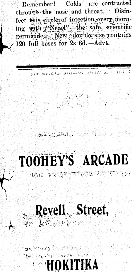 Remember! Colds are contracted through' the nose and throat. Disinfeet inf^ction^very.rnorning safe, -scientific size icontaips 120 fntJ boses for 2s 6d.—Advt. LTOdfIEY’S ARCADE ■itiili : ■ Revell Street, i kSrJsy -'i: :■■■■: