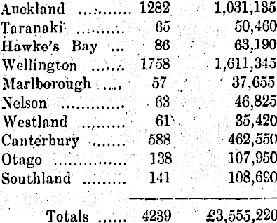 Auckland .... 1282 1,031,135 Taranaki 50,460 Hawke’s Bay . 86 . 63,190 Wellington ..... ., 1758 1,611,345 Marlborough ... 57 37,655 Nelson 63 46,825 Westland 61 35,420 Canterbury .. 588 462,550 Otago ... 138 107,950 Southland ....... ... 141 108,680 Totals ... ... 4239 £3,555,220
