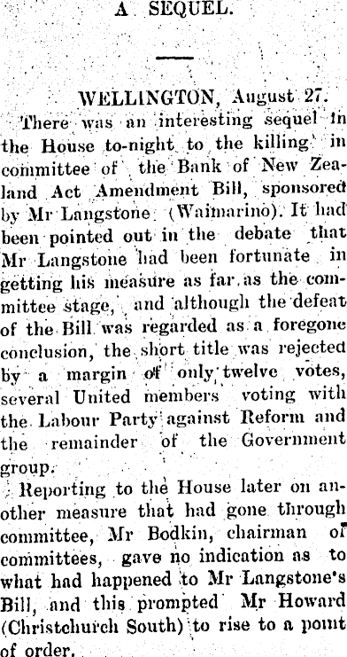 A SEQUEL. WELLINGTON, August 27. There was an interesting sequel In the House to-night to the killing’ in committee of the Bank of New Zealand Act Amendment Bill, sponsored by Mr Langstone (Wnimarino). It had been pointed out in the debate that Mr Langstone had been fortunate in getting his measure as far, as the committee stage,' and although the defeat of the Bill was regarded as a foregone conclusion, the short title was rejected by a margin of only'twelve votes, several United members voting with the Labour Party’against Reform and the remainder of the Government group; Reporting to the House later on another measure that had gone through committee, Mr Bodkin, chairman oi committees, gave no indication as to what had happened to Mr Langstone's Bill, and this prompted Mr Howard (Christchurch South) to rise to a point of order.