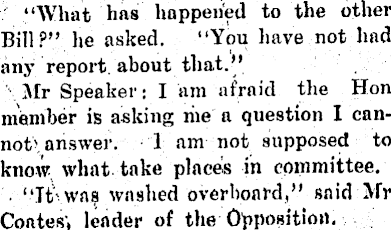 “What has happened to the other Bill?” he asked. “You have not had any report, about that.” Mr Speaker: I am afraid the Hon member is asking me a question I cannot'answer. lam not supposed to know what take places in committee. “It was washed overbonrd,” said Mr Contes', leader of the Opposition.