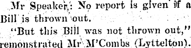 Mr Speaker.': No report is given' if a Bill is thrown out. “But this Bill was not thrown out,” remonstrated Mr M’Combs (Lyttelton).