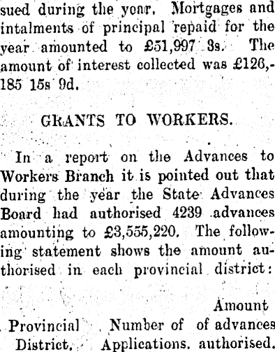 sued during the yoar. Mortgages and intalments of principal repaid for the year amounted to £51,997 3s. The amount of interest collected was £126,185 15s 9d. GRANTS TO WORKERS. In a report on the Advances to Workers Branch it is pointed out that during the year the State Advances Board had authorised 4239 advances amounting to £3,555,220, The following statement shows the amount authorised in each provincial district: Amount Provincial , Number of of advances District, Applications, authorised.