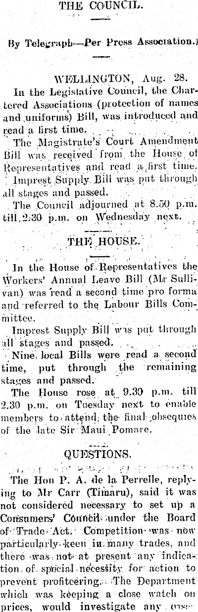 THE COUNCIL. By Telegraph—Per Press Association.) WELLINGTON, Aug. 28. In the Legislative Council, the Chartered Associations (protection of names and ..uniforms) Bill, was introduced and read a first time. The Magistrate’s Court Amendment Bill was Received from the House of Representatives and read a.first time. Imprest Supply Bill was put through all stages aucl passed. The Council adjourned at 8.50 p.iu. till, 2-30 p.lll. on Wednesday next. THE HOUSE. In the House of-Representatives the Workers’ Annual Leave Bill (Air Sullivan) was Vend a second time pro forma and referred to thq Labour Bills Committee. Imprest Supply Bill was put- through all stages and passed. Ninel local Bills were read a second time, put through the remaining stages and passed. The House rose, at 9.39 p.lll. till 2.30 p.ni. on Tuesday next to enable members to. attend; the- final/obsequies of the late Sir Maui Pomare. QUESTIONS. The HOll P. A. do la Perrelle, replying to Air Carr (Timaru), said it was not considered necessary to set up a Consumers’ CdUrtfcii- amder the Board of- Trade- Act. Competition- ‘was now particularly -keen in. many trades, and there -was not- at present any indica-. tion. of. spricial necessity for action to prevent profiteering. The Department which was keeping a close watch on prices, would investigate any ois.-