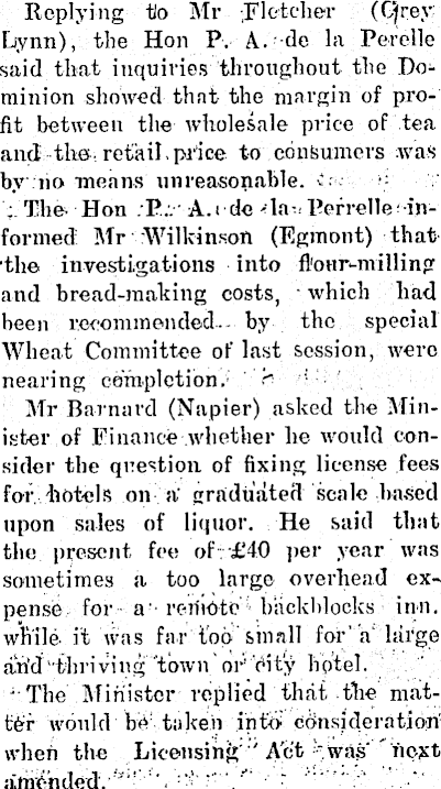 Replying to Air Fletcher (Qrey Lynn), the Hon P. A. de la Perelle said that inquiries throughout tlie Dominion showed that the margin of profit between the wholesale price of tea and the retail price to consumers was by 110 means unreasonable, i; .- u ; The Hon P... A.i de -la-, Perrelle -informed Air Wilkinson (Egmont) that •the investigations into flour-milling and bread-making costs, which had been recommended, by the special Wheat Committee of last session, were nearing completion. h ; Air Barnard (Napier) asked the Minister of Finance whether lie would consider the question of fixing license fees for hotels on a: graduated scale based upon sales of liquor. He said that the present fee of : £4O per year was sometimes a too large overhead expense for a' ren'iCte biickblocks inn. while- it was far tod sin all for' a large an'd'thriving town oddity hotel • The Miftistor replied that the matter would be taken into ednsideration whefi the Licensing Act 'was ' next filndhded. : "' ! ", '■ /'