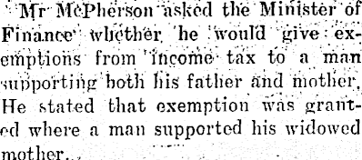 ‘Air AfdPlierson 'fisked the Minister of Finance' Ivljother. he :would give ex-? eiiniptions from ’ income; tax to a man supporting both liis father and mother, He stated that exemption was granted where a mail supported his widowed mother.,,