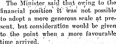 The Minister, said that owing to the financial position it' was not. possible to adopt a more generous scale at present, but consideration would he given to the point when a more favourable time arrived.