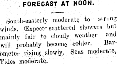 FORECAST AT NOON. South-easterly moderate to strung winds. (Expect" scattered showers but mainly fair to cloudy weather and will probably become colder. Barometer rising slowly. Seas moderate, Tides moderate.