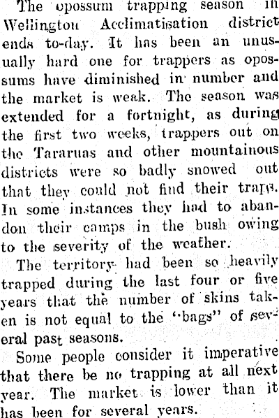 The opossum trapping season in Wellington Acclimatisation, district ends to-day. It lias been an unusually hard one for trappers as opossums have diminished in. number and the market is weak. The season wap extended for a fortnight, as during the first two weeks, trappers out on the Tararuns and other mountainous districts were so badly snowed out that they could not find their traps. In some instances they had to abandon their camps in the bush owing to the severity of the weather. The territory had been so heavily trapped during the last four or five years that the number of skins taken is not equal to the ‘‘bags’ of several past seasons. Some people consider it imperative that there be no trapping at all next year. The market is lower than it has been for several years.