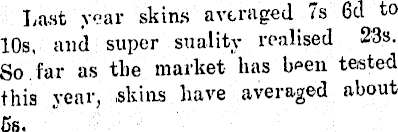 Last year skins averaged 7s 6d to 10s, and super suality realised 235. So far as the market has been tested this year, skins have averaged about Gs.