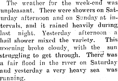 The weather for the week-end was unpleasant . There were showers on Saturday afternoon and on Sunday at intervals, and it rained heavily during last night. Yesterday afternoon a hail shower mixed the variety. This morning broke cloudy, with the sun struggling to get through. There 1 Was a fair flood in the river on Saturday nnd yesterday a very heavy sea was running.