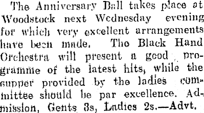 The Anniversary Dali takes place at Woodstock next Wednesday evening for which very excellent arrangements have been made. Tho Black Hand ■Orchestra will present a good. programme of the latest hits, while the r,upper provided by the ladies committee should be par excellence. Adi mission, Gents 3s, Ladies 2s.—Advt.