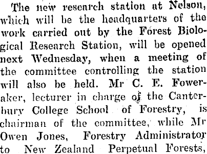 The new research station at Nelson, which will he the headquarters of the work carried out by the Forest Biol°* gical Research Station, will be opened next Wednesday, when a meeting of the committee controlling the station will also be held. Mr C. E. Foweraker, lecturer in charge oj the Canterbury College School of Forestry, is chairman of the committee, while Mr Owen Jones, Forestry Administrator to New Zealand Perpetual Forests,