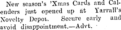 New season’s ’Xmas Cards and Calenders jivst opened up at Yarrall’s Novelty Depot. Secure early and avoid disappointment.—Advt.