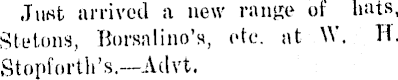 Just arrived a new range of hats, Stolons, Borsalino’s, elc. at W. H. Stopfortli’s.—Advt.