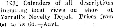 1931 Calenders of all descriptions inoiuUiiLg local views on show at Yarrall’s Novelty Depot. Prices from OU to is lid.— Advt.