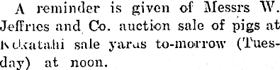 A reminder is given of Messrs W. Jeffries and Co. auction sale of pigs at KeUatafii sale yarus to-morrow (Tuesday) at noon.