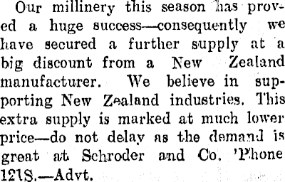 Our millinery this season has proved a huge success—consequently we have secured a further supply at a big discount from a New Zealand manufacturer. We believe in supporting New Zealand industries. This extra supply is marked at much lower price—do not delay as the demand is great at Schroder and Co, 'Phone mS.—Advt.