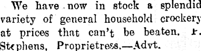 We have now in stock a splendid variety of general household crockery at prices that can’t be beaten. Jr. Stephens, Proprietress.—Advt;.