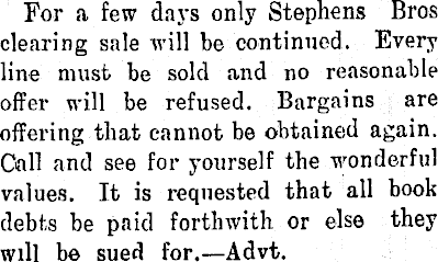 For a few days only Stephens Bros clearing sale will be continued. Every line must be sold and no reasonable offer will be refused. Bargains are offering that cannot be obtained again. Call and see for yourself the wonderful values. It is requested that all book debts be paid forthwith or else they will he sued for.—Advt.