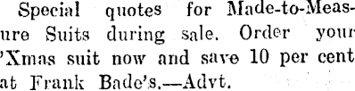 Special quotes for Made-to-Meas-ure Suits during sale. Order your 'Xmas suit now and save 10 per cent at Frank Bade’s.—Advt.