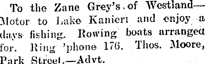 To the Zane Grey’s ,of Westland— Motor to Lake Kanieri and enjoy a days fishing.. Rowing boats arranged for. Ring ’phone 176. Thos. Moore, Park Street. —Advt.