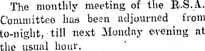 The monthly meeting of the R.S.M Committee has been adjourned from to-night, till next .Monday evening at the usual hour.