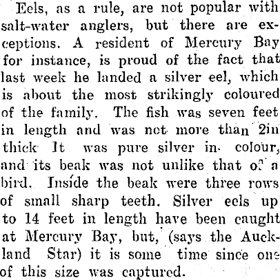 Eels, as a rule, are not popular with salt-water anglers, but there are exceptions. A resident of Mercury Bay for instance, is proud of the fact that last week he landed a silver eel, which is about the most strikingly coloured of the family. The fish was seven feet in length and was not more than 2in thick ft was pure silver in- colour, and its beak was not unlike that of a bird. Inside the beak were three rows of small sharp teeth. Silver eels up to 14 feet in length have been caught at Mercury Bay, but, (says the Auckland Star) it is some time since one of this size was captured.