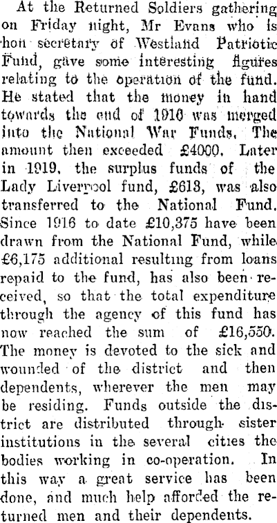 At the Returned Soldiers gathering on Friday night, Mr Evans who is •lion secretary elf Whstlalid Patriotic Fului, gave some interesting figures relating to the operation of the fund. He stated that the money in hand towards the etui of 1910 was merged into the National War Funds, The amount then exceeded £4OOO. Later in 1919, the surplus funds of the Lady Liverpool fund, £6lB, was also transferred to the National Fund. Since 1916 to- date £10,375 have been drawn from the National Fund, while £6,175 additional resulting from loans repaid to the fund, has also been received, so that the total expenditure through the agency of this fund has now reached the sum of £16,550. The money is devoted to the sick and wounded of the district and then dependents, wherever the men may be residing. Funds outside the district are distributed through- sister institutions in the several cities the bodies working in co-operation. In this way a great service has been done, find much help afforded the returned men and their dependents.