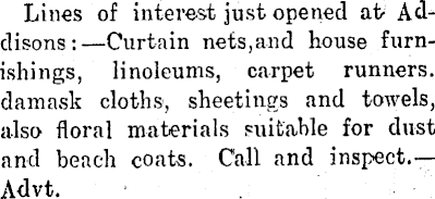 Lines of interest just opened at Addisons:—Curtain nets,and house furnishings, linoleums, carpet runners, damask cloths, sheetings and towels, also floral materials suitable for dust and beach coats. Call and inspect.— Advt.