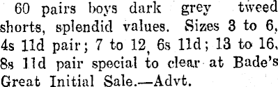 60 pairs boys dark grey tweed shorts, splendid values. Sizes 3 to 6, 4s lid pair; 7 to 12, 6s lid; 13 to 16, 8s lid pair special to clear at Bade’s Great Initial Sale.—Advt.