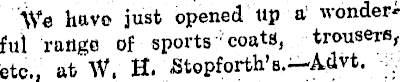 We have just opened up a fill range of sports coats, trousers, etc., at W, H. Stopforth’s.—Advt.