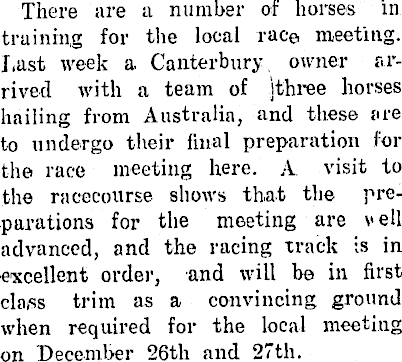 There are a number of horses in training for the locai race meeting. Last week a Canterbury owner arrived with a team of jthree horses hailing from Australia, and these are to undergo their final preparation for the race meeting here. A visit to the racecourse shows that the preparations for the meeting are veil advanced, and the racing track is in excellent order, and will be in first class trim as a convincing ground when required for the local meeting on December 26th and 27th.