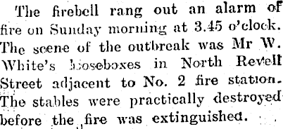 The firebcll rang out an alarm of fire on Sunday morning at 3.45 o’clock. Til© scene of the outbreak was Mr W. White’s ’i.vosoboxes in North ReVeit Street adjacent to No. 2 fire station. The stables were practically destroyed before the , fire was extinguished.