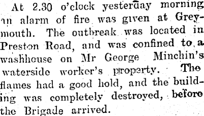 At 2.30 o’clock yesterday morning an alarm of fire was given at Greymouth. The outbreak was located in Preston Road, and was confined to. a washhouse on Air George Minch in s waterside worker’s property. The flames had a good hold, and the building was completely destroyed, before the Brigade arrived.